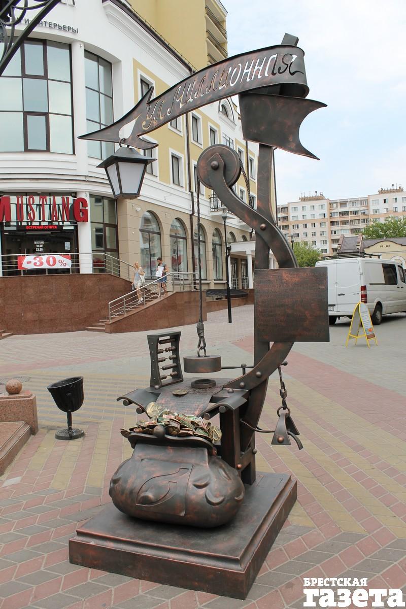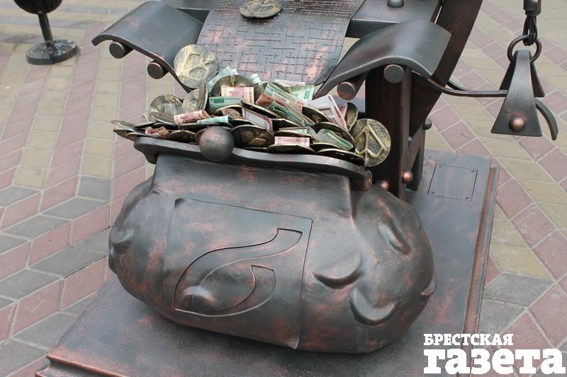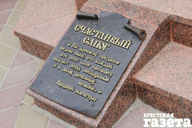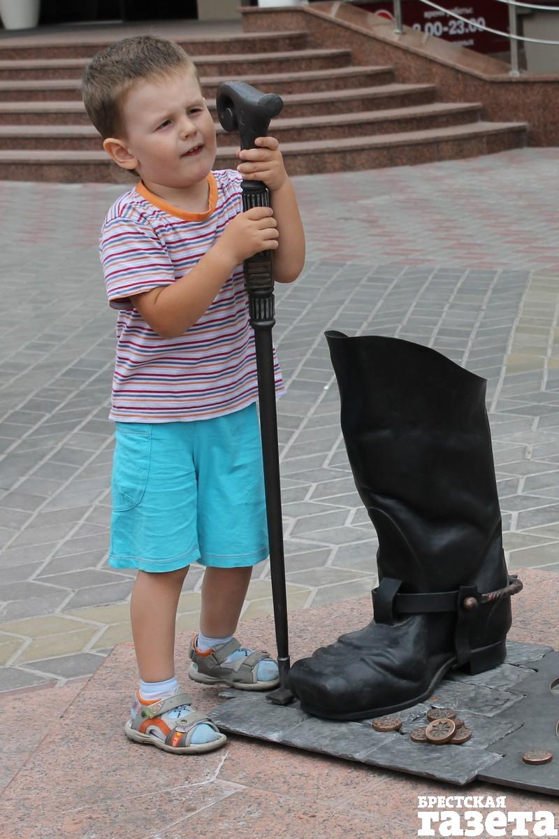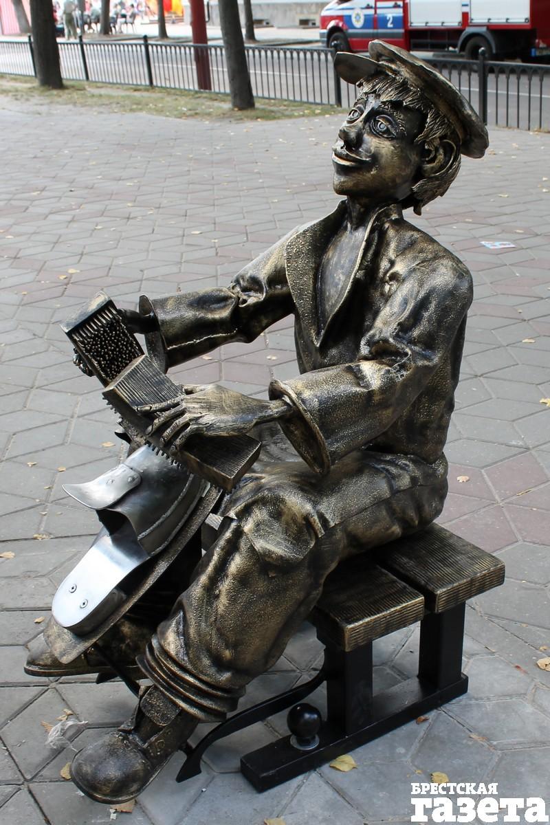 Охотно подставляют свои ножки брестчане кованому чистильщику обуви. И даже платят за труд. Оставить 100-рублевки стремятся и в «денежном» фонаре, который напоминает о прежнем названии ул. Советской — Миллионная, и в сапоге. Примерившему его обещают «доход неслыханный».