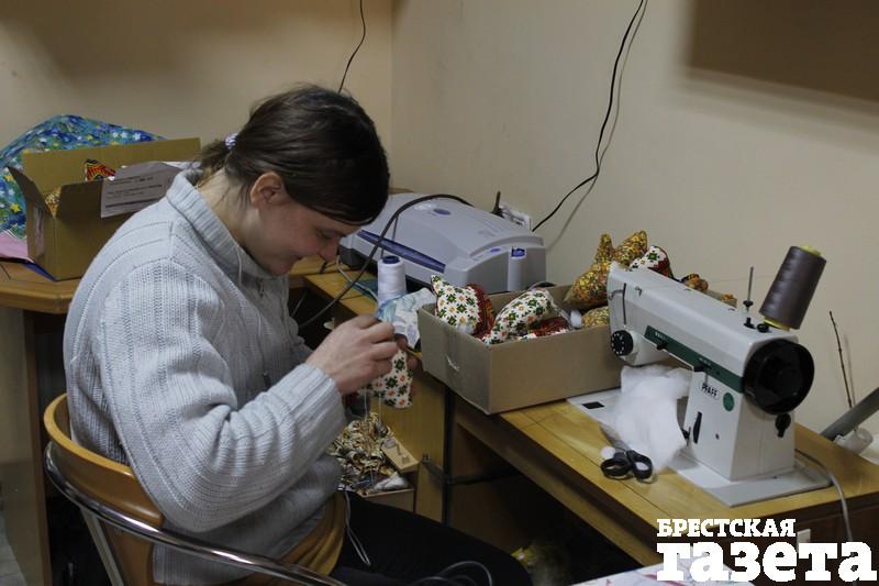 Решено было производить сувенирную продукцию. Начинали с открыток ручной работы, но постепенно ассортимент разросся так, что всего не перечислишь. На полках в мастерской стоят цветы, шкатулки, новогодние елочки, лежат магниты с белорусским орнаментом и бабочки, сплетенные из бисера. Каждый человек выполняет свой кусочек работы, а сотрудники мастерских следят за качеством. Готовые сувениры можно купить в Бресте, Минске, Пружанах, Жодино и других городах. За проданную продукцию ребята получают деньги. Не очень большие, но радуются они любым суммам.