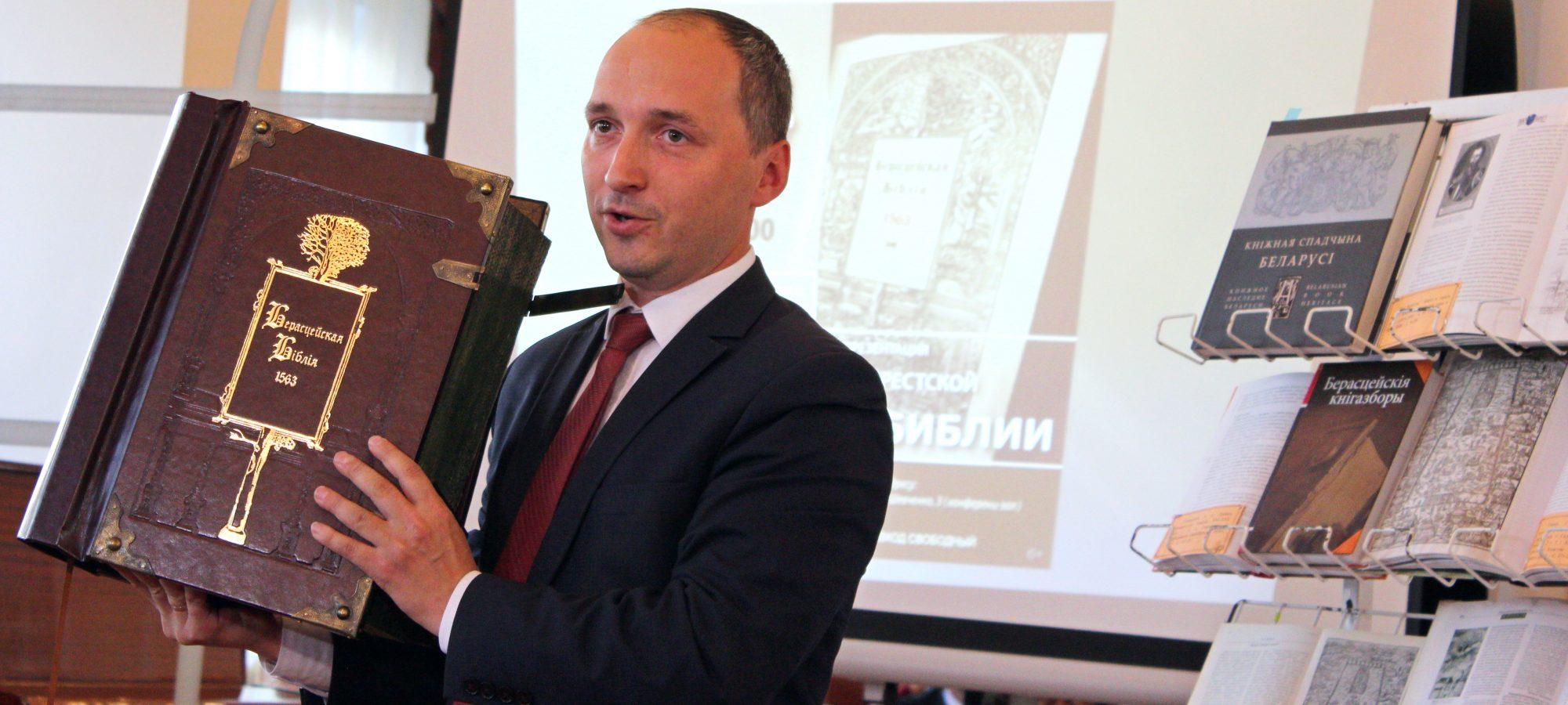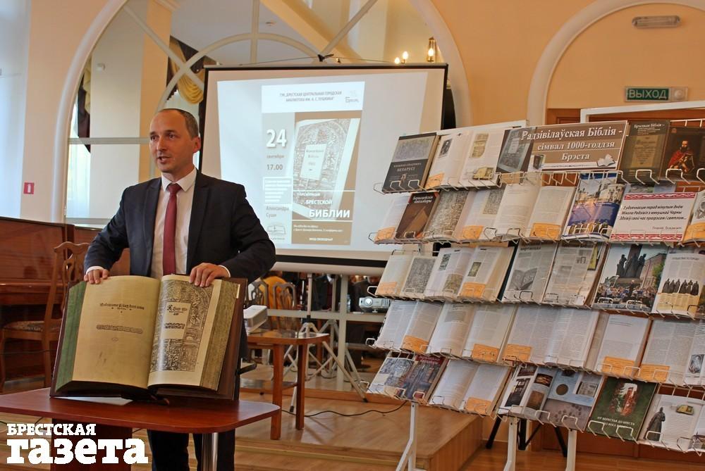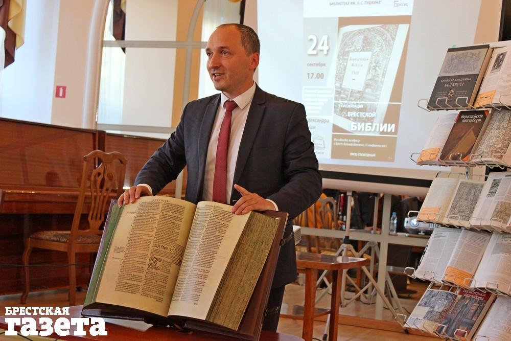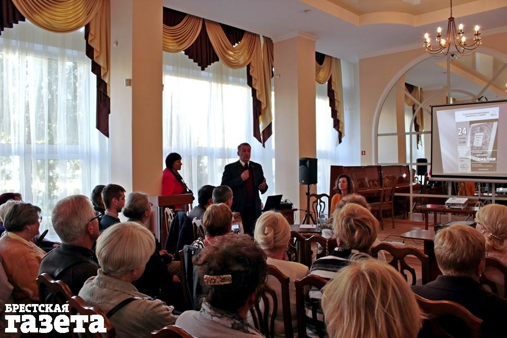 Главным героем встречи стал Александр Суша, координатор и научный руководитель издания, автор исследования о Брестской Библии, заместитель директора Национальной библиотеки Беларуси. Он рассказал, что такое Берестейская Библия и почему сегодня пришли к ее факсимильному восстановлению. Он отметил, что именно эта книга является новаторским изданием, одним из главных сокровищ на протяжении века, символом возвращения, подтверждением свободомыслия и толерантности, шедевром полиграфического мастерства, символом жертвенности и меценатства, символом современного Бреста.