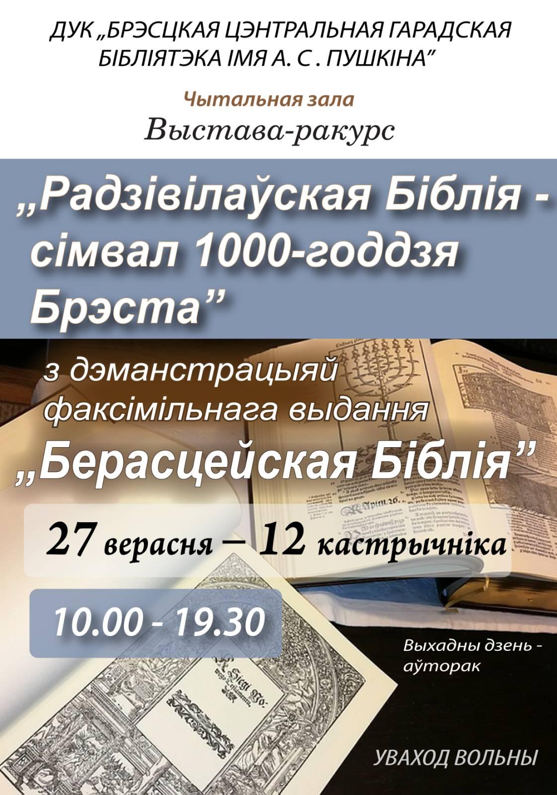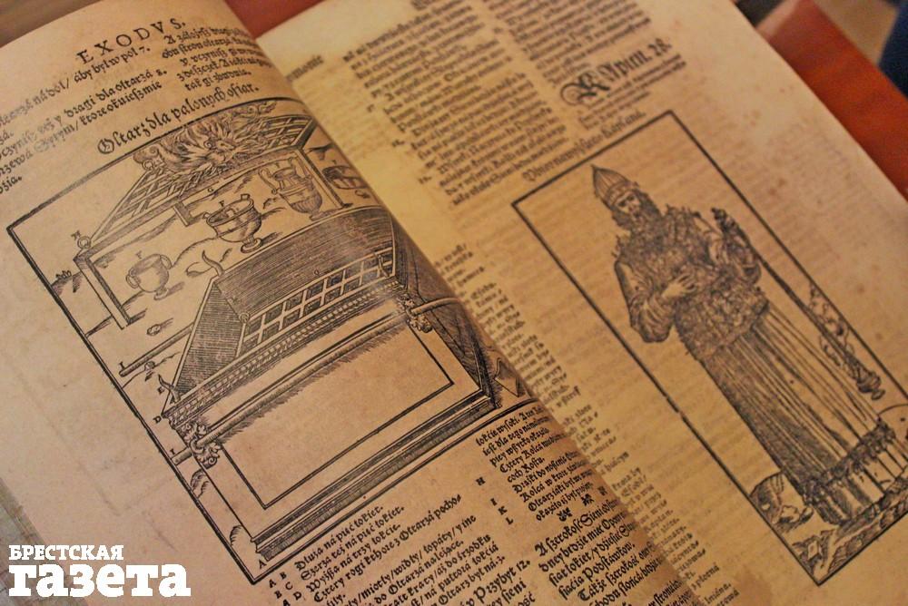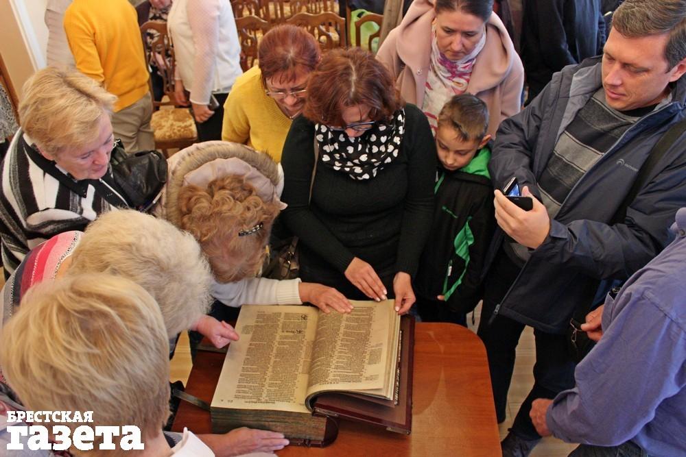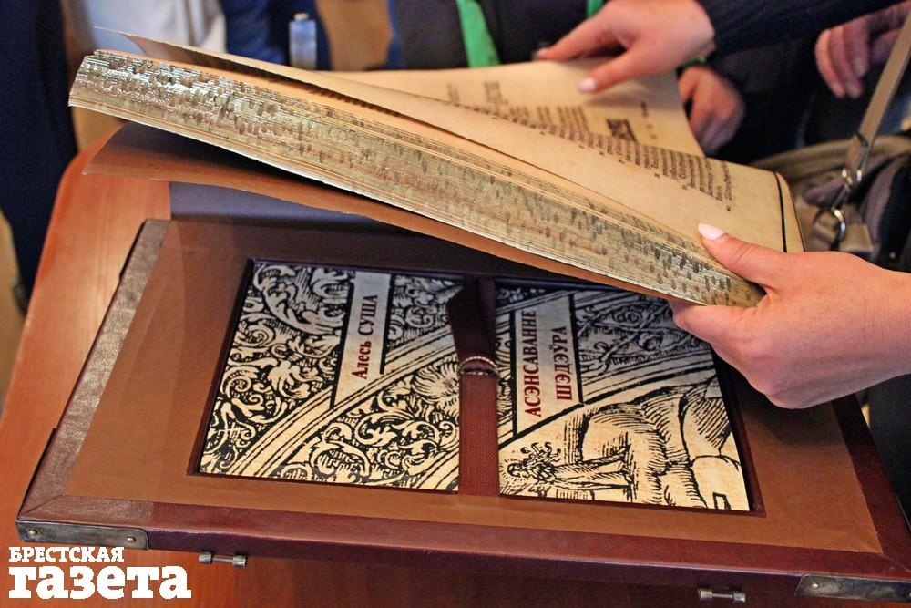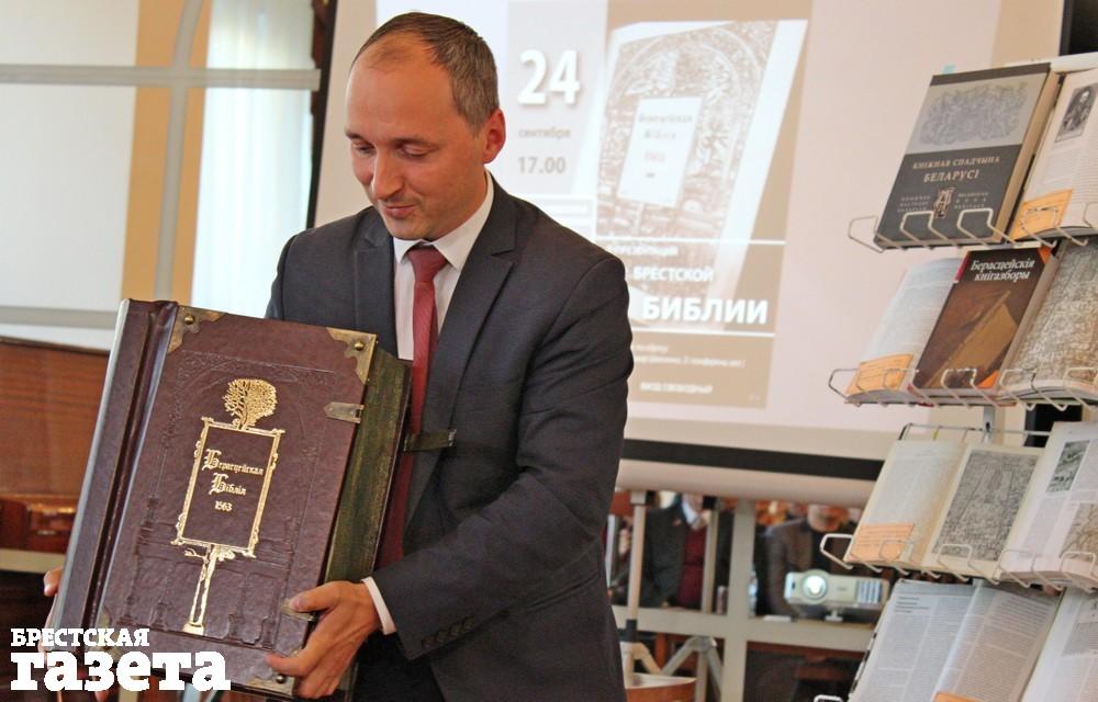 Факсимильное издание Брестской Библии представили публике в Брестской центральной городской библиотеке 24 сентября. Самая большая книга в истории отечественной печати весит 15 кг и насчитывает более 1 400 страниц. Кожа, металлические заклепки, два титульных листа, гравюры – это все о ней. Воссозданы все особенности оригинала: размер, характер печати, бумага, рукописные надписи и пометки на страницах книги. Полностью вручную был выполнен специальный переплет.
