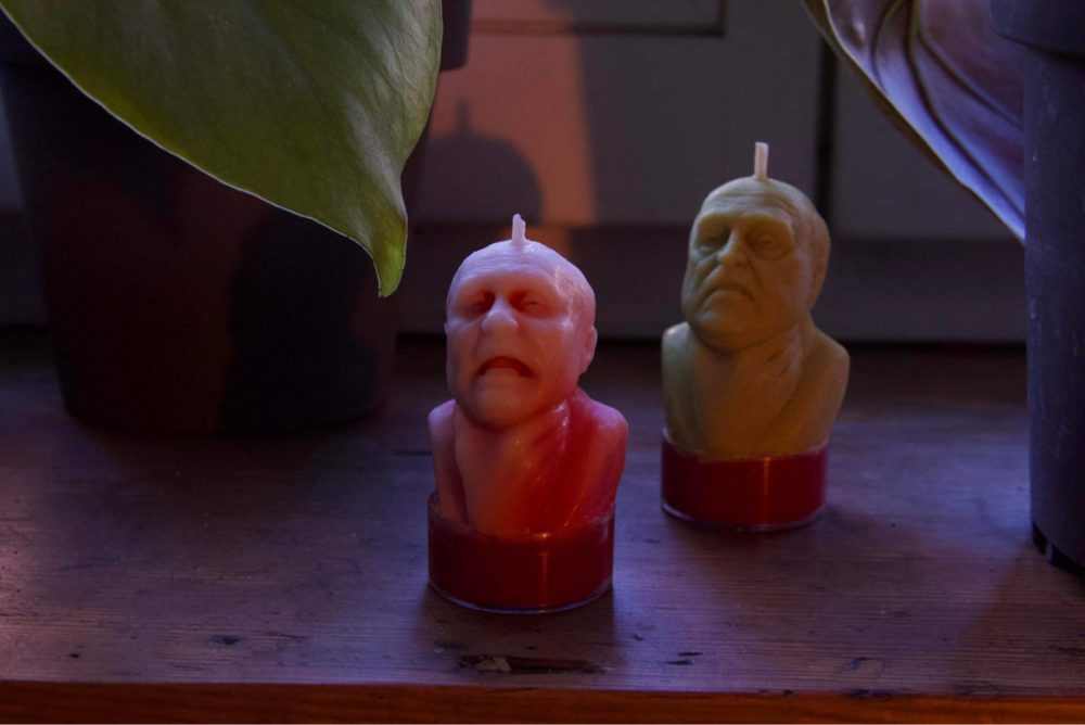 Сейчас художник работает над серией ароматических свечей с изображениями современных диктаторов. Это маленькие бюсты из соевого воска с рукой на шее, которая душит их. Именно поэтому свечи называются «Душыстыя».