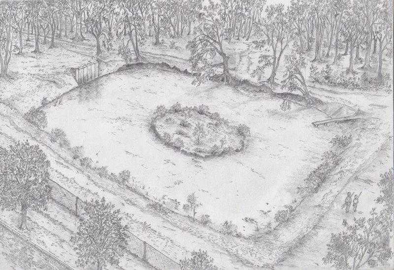 На рисунке Губенко изобразил, как выглядел пруд в 1944 году. Зимой там организовывали каток, напрокат можно было взять коньки, санки, финские сани.
