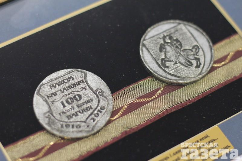 Панно содержит две монеты из состаренного алюминия. На одной из них отчеканена надпись «Максім Багдановіч. 125 гадоў. 1851 — 2016», на второй — рыцарь на коне. Всадник с воздетым мечом и щитом изображался на знаменитой «Погоне». Берестейское воеводство в качестве герба использовало серебряную «Погоню» в червленом щите, латы и сбруя рыцаря были голубыми.