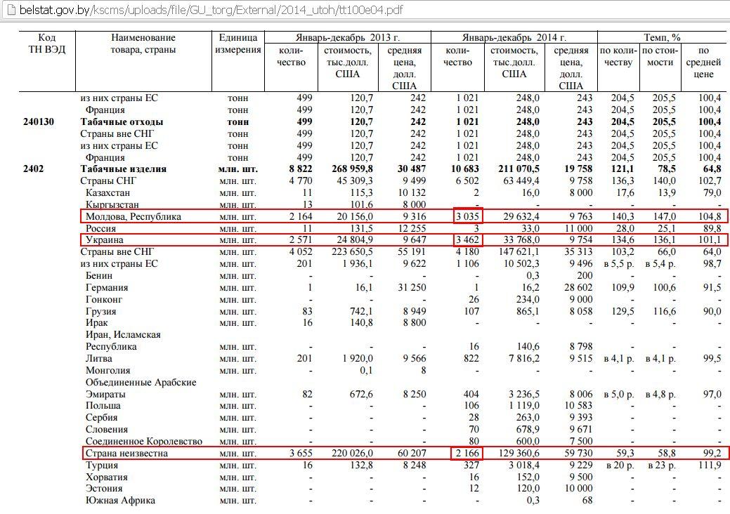 В какие страны они едут? Согласно информации Национального статистического комитета, крупнейшим покупателем наших табачных изделий в 2014 году была Украина — 3 462 миллиона штук. (Штук, а не пачек! Чтобы перевести в привычные пачки, надо разделить на 20, а чтобы перевести в короба — еще на 500), или 346,2 тысяч коробов. На втором месте – Молдова (3 035 миллионов штук). А на третьем — 2 166 миллионов штук («страна неизвестна»). Так и написано в статистическом отчете за 2014 год.