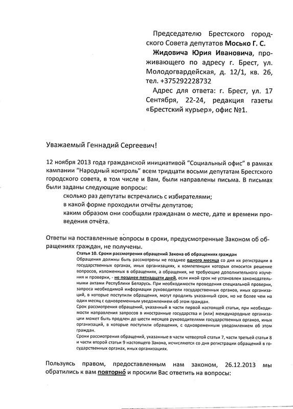 Первое письмо было отправлено Геннадию Мосько еще 12 ноября минувшего года в рамках кампании «Народный контроль». В нем активисты спрашивали, где, когда и какое количество граждан принял председатель, будучи депутатом. Однако ответа, который по закону положено дать в течение 15 дней, не последовало.