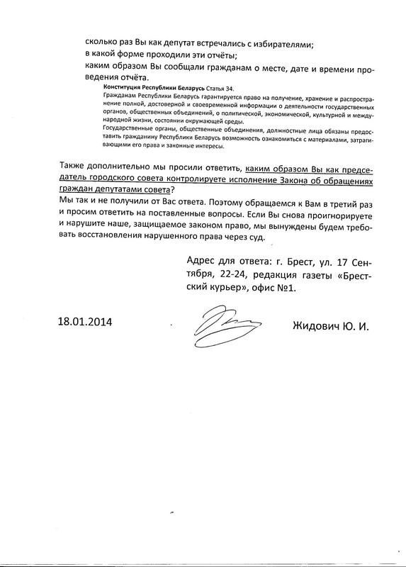 В третий раз было отправлено письмо с уведомлением. «20 января Геннадий Мосько лично получил и расписался за наше письмо. А поэтому, согласно закону, в течение 15 дней он обязан будет предоставить нам ответ», — сообщает активист гражданской инициативы Юрий Жидович.