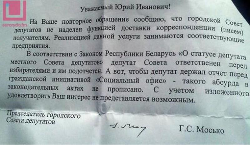 И ответ за подписью председателя городского Совета депутатов Геннадия Мосько был получен. «В соответствии с Законом Республики Беларусь «О статусе депутата местного Совета депутатов» депутат совета ответственен перед избирателями и им подотчетен. А вот чтобы депутат держал отчет перед гражданской инициативой «Социальный офис», такого абсурда в законодательных актах не прописано. С учетом изложенного удовлетворить ваш интерес не представляется возможным», — говорится в письме.