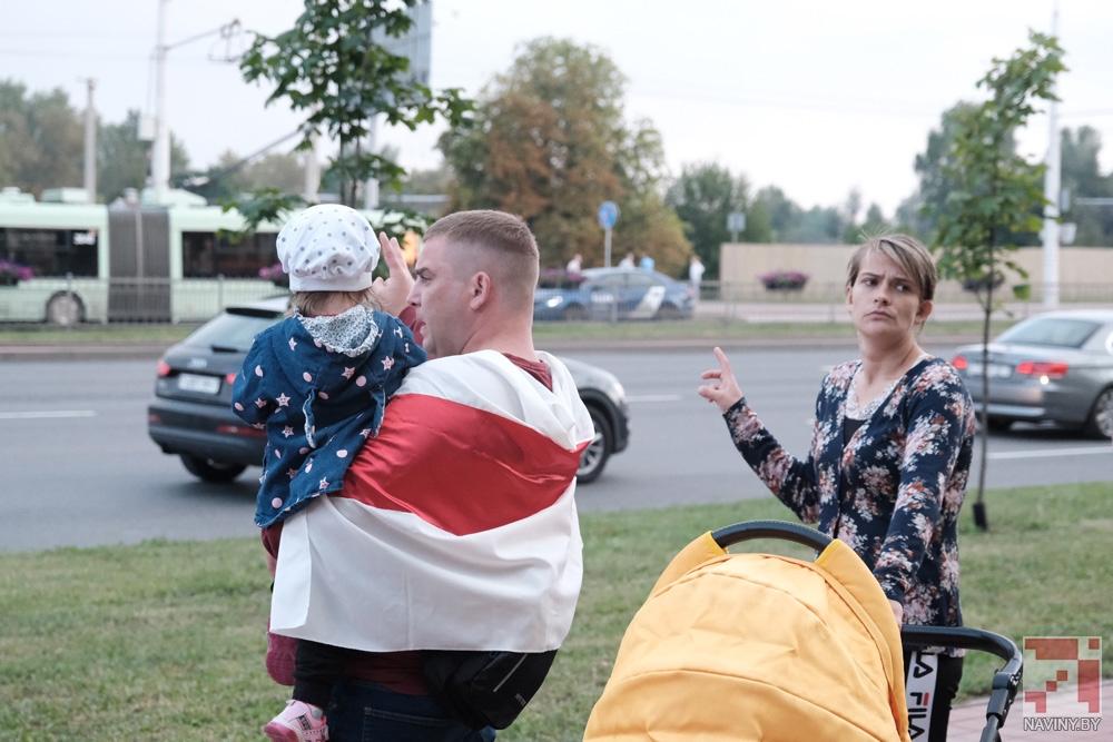 Участники акции стояли с цветами, бело-красно-белыми флагами и плакатами, осуждающими насилие со стороны силовиков. Проезжающие мимо автомобили сигналили в знак поддержки.
