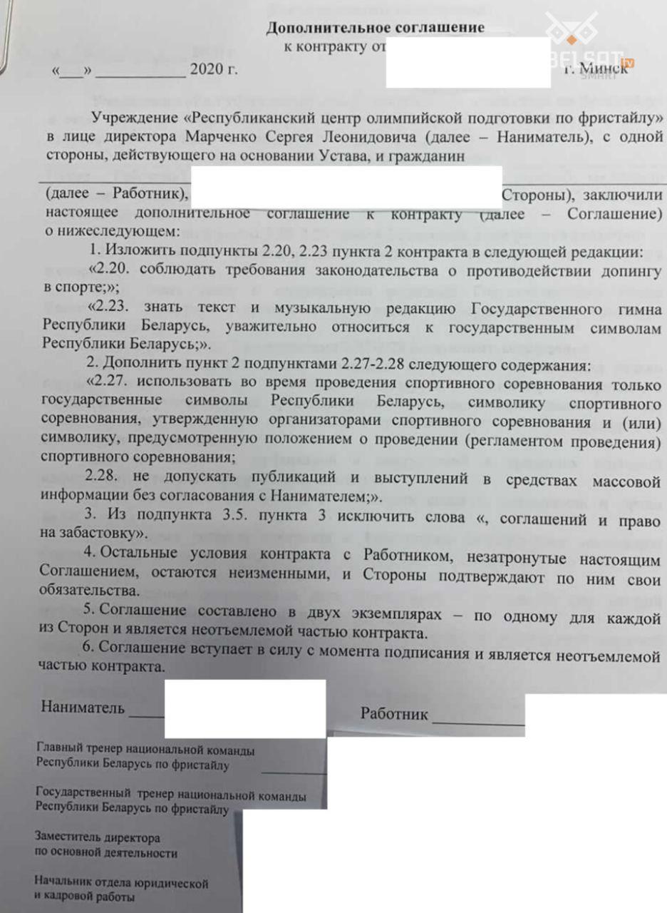 А 21 сентября телеканал «Белсат» также опубликовал дополнительное соглашение в РЦОП по фристайлу. Спортсменов обязывают выучить гимн и использовать только государственную символику.