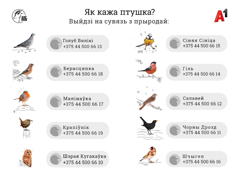Звонки на все 10 номеров бесплатны для абонентов А1, кроме тех, кто находится в роуминге. Прежде чем вы услышите голос птицы по телефону, вас поприветствуют «птичьи секретари». В их роли выступили актеры Купаловского театра Роман Подоляко и Кристина Дробыш.