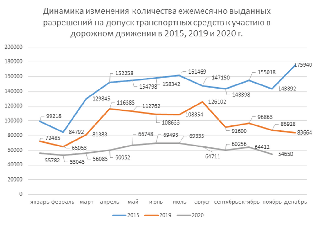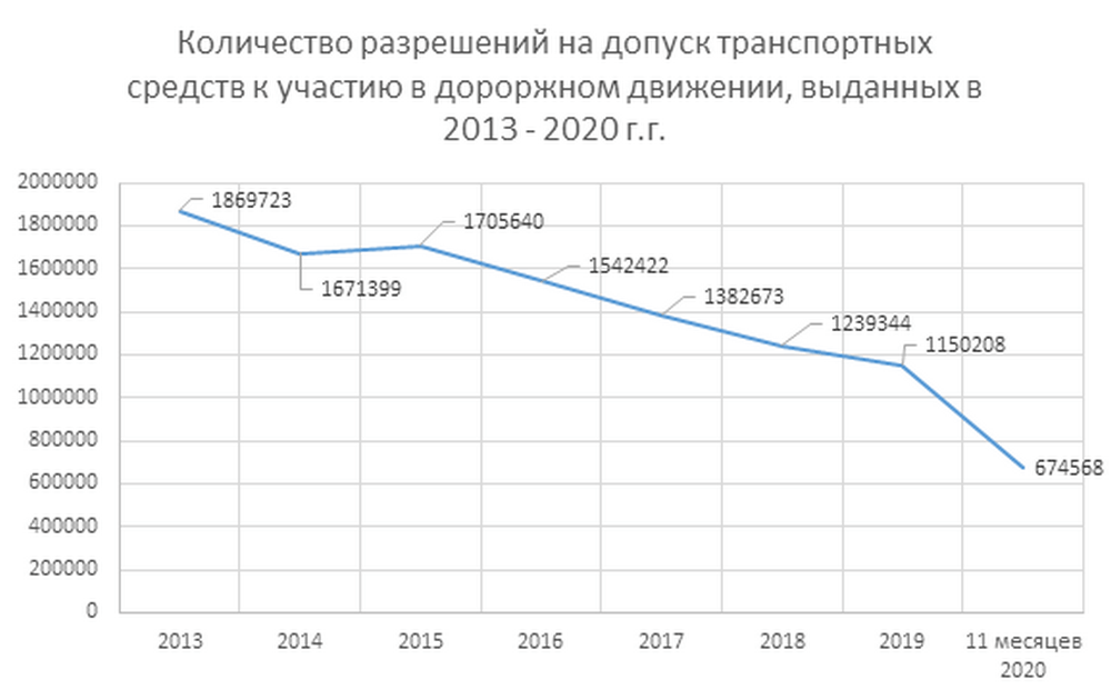 Так, за 11 месяцев текущего года выдано 674 568 разрешений на допуск транспортных средств к участию в дорожном движении. Это на 36,8% меньше аналогичного показателя за январь – ноябрь 2019 г. (1 066 548 ед.).