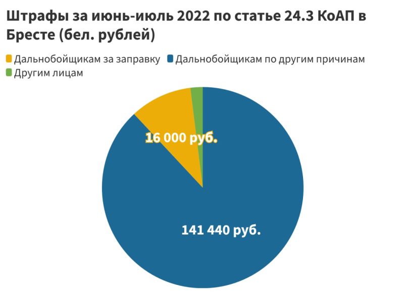 Брестская «Весна» проанализировала судебные решения по статье 24.3 КоАП, которые рассматривались в июне–июле 2022 года в трех судах: Московском суде Бреста, Ленинском суде Бреста и суде Брестского района. Статья 24.3 КоАП называется «неповиновение должностному лицу», но 101 из 121 судебного решения за этот период были вынесены за «неповиновение» сотруднику таможни. Суммарно дальнобойщиков за два месяца осудили на 61 тысячу долларов.