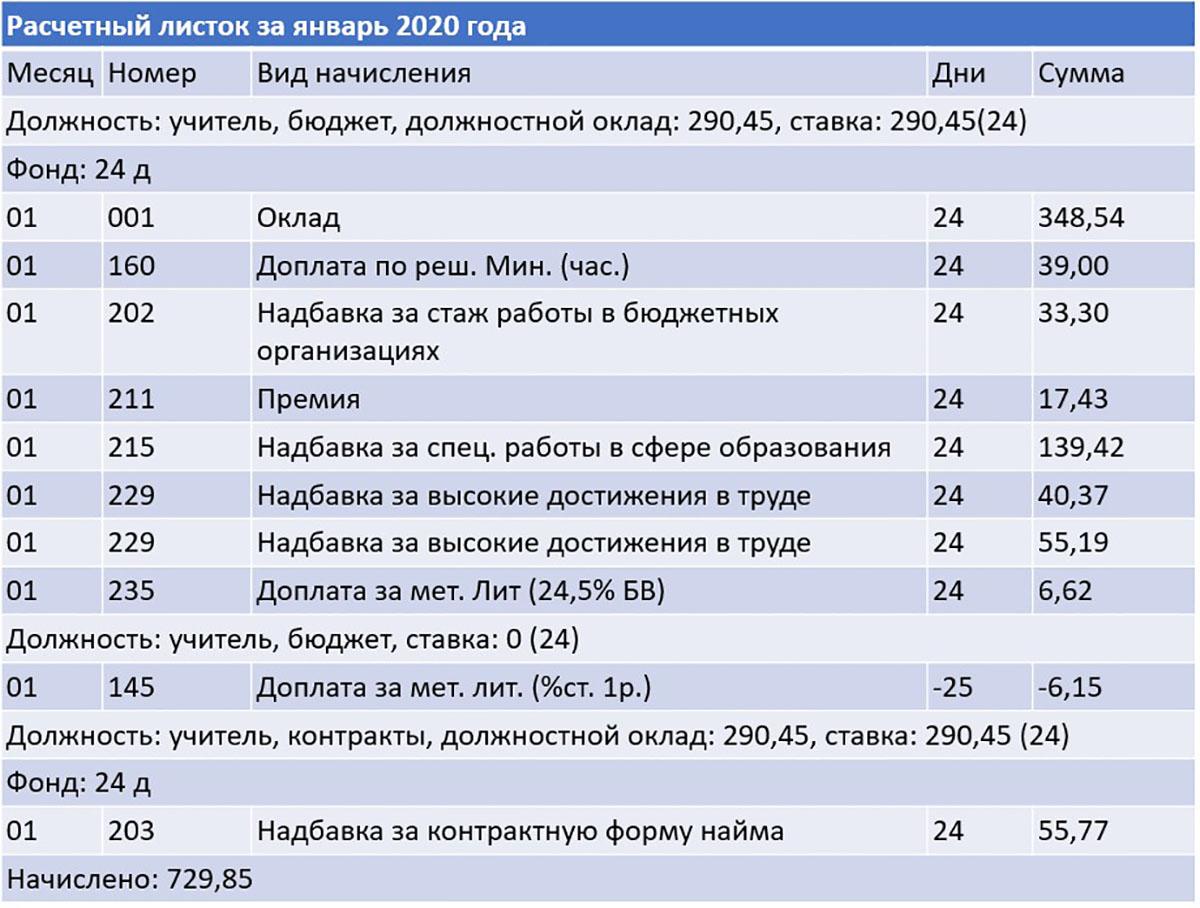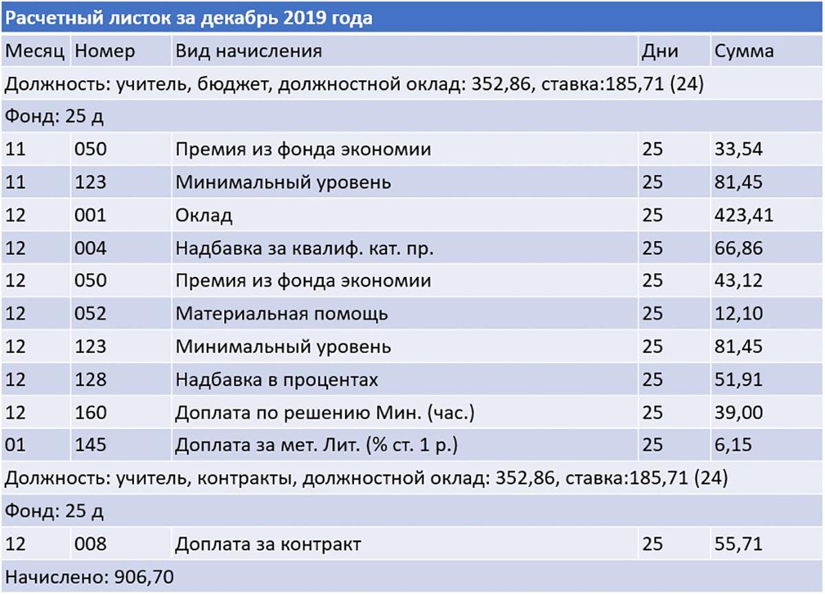 А учитель математики средней школы одного из агрогородков Беларуси в ноябре за 23 дня получил 1 002,71 рубля, в декабре за 24 — 1 016,06, а в январе за 23 — 872,74. Разница в суммах между двумя месяцами прошлого года и январем этого — больше 140 рублей.
