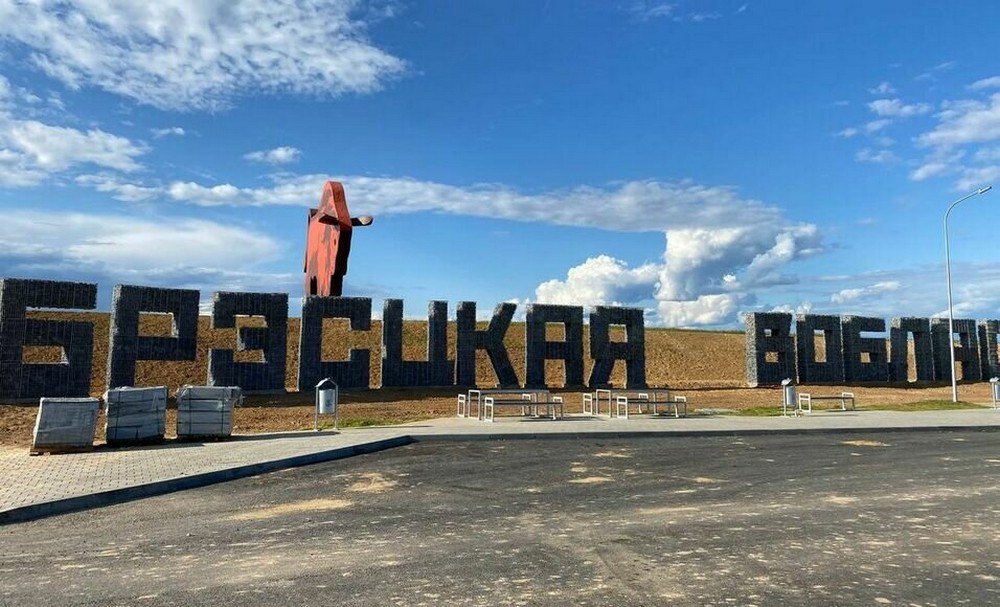 Рядом с недавно оборудованной парковкой появилась надпись «Брестская область». Каждая буква в этой надписи — габион высотой несколько метров. Судя по тому, что рядом лежат упаковки с проволокой и стоит строительная техника, декоративный элемент еще не завершен.