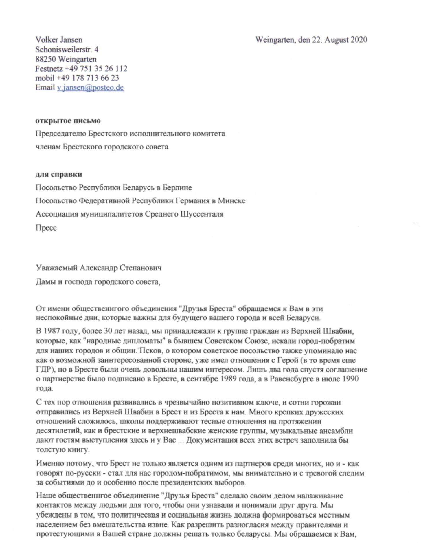 Общественное объединение «Друзья Бреста», которое представляет города-побратимы нашего города в Германии, обратилось с открытым письмом к председателю Брестского горисполкома Александру Рогачуку и депутатам горсовета.