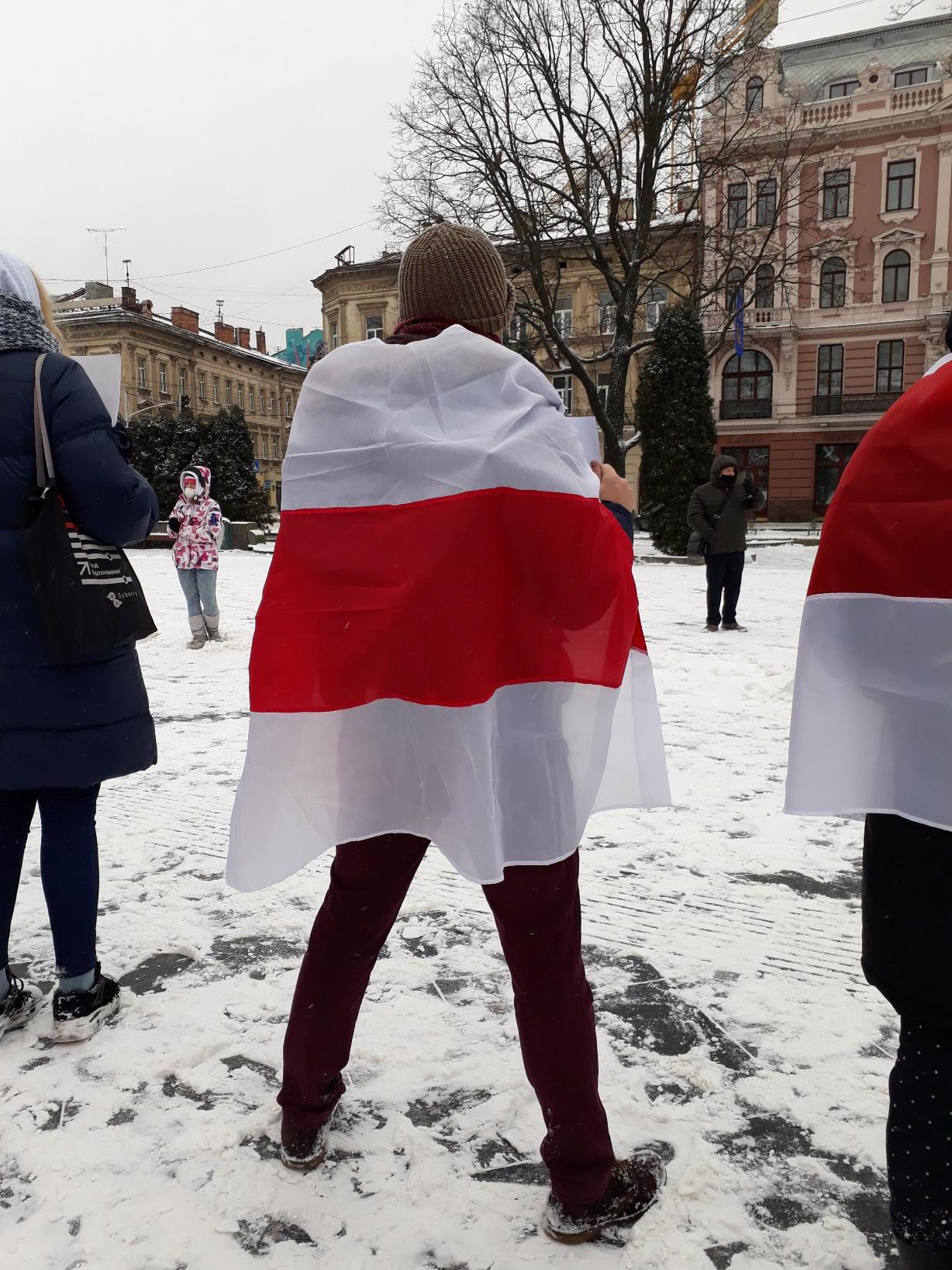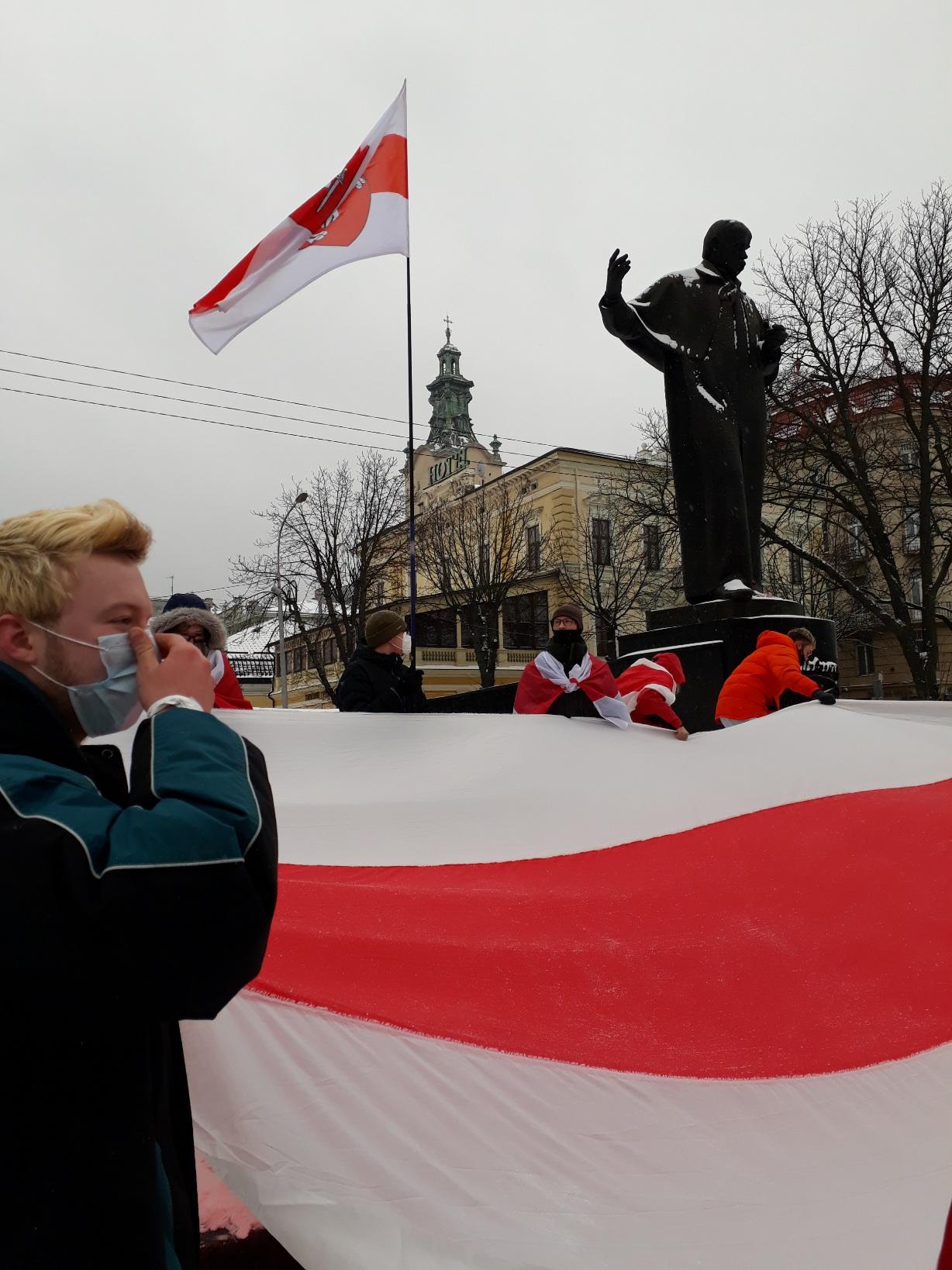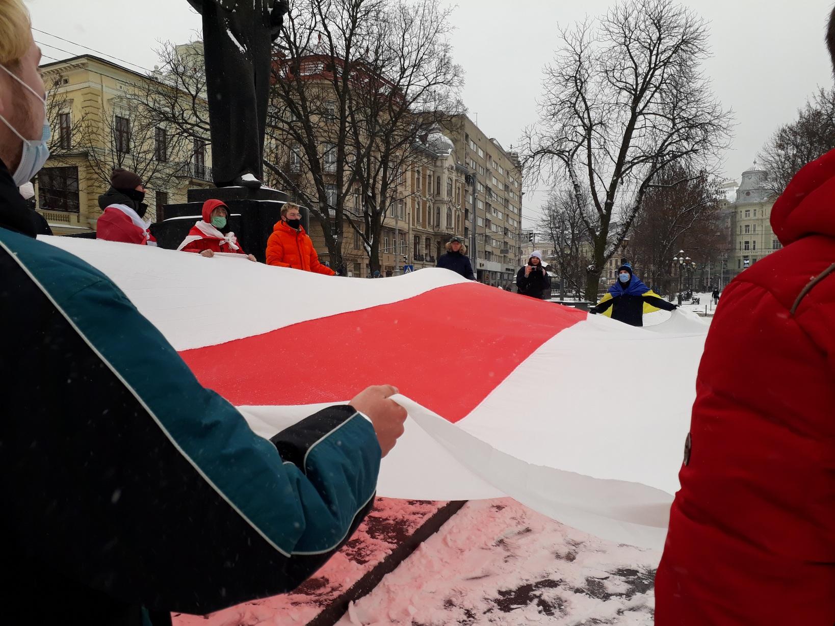 В День солидарности бчб-флаги и плакаты с именами политзаключенных появились возле памятника Тарасу Шевченко — в месте белорусских акций, уже ставшем традиционным. По такому поводу развернули огромный флаг, спели знаковые песни. Проходящие львовяне высказывали солидарность кличем: «Жыве Беларусь!»