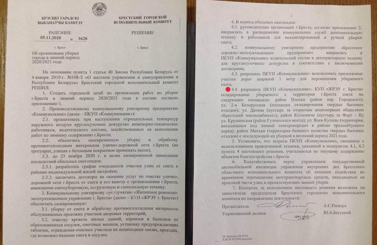 Коммунальные службы и предприятия вывозят снег в места, определенные решением горисполкома «Об организации уборки города в зимний период 2020/2021 года»: на Плоску – в район переулка Городского, на площадку складирования твердых бытовых отходов на 2-й Белорусской, на пустырь за Брестским мясокомбинатом на улице Дачной, в Козловичи – пустырь за Фортом-8, на улицу Крушинскую в районе Гузнянского моста, на территорию под линией электропередач в районе троллейбусного парка на Янки Купалы, а также на бывший полигон твердых бытовых отходов в районе Митьки.