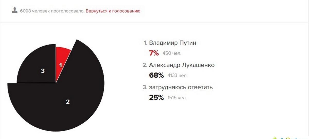Напомним, по прошествии суток с момента начала голосования на вопрос «Кто должен возглавить Союзное государство России и Беларуси?» лишь 7% высказались за президента России Владимира Путин. Кандидатура президента Беларуси Александр Лукашенко набрала 68% голосов пользователей.