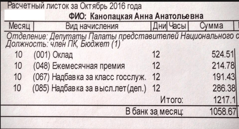 Экс-депутат Палаты представителей Национального собрания Республики Беларуси Анна Канопацкая выложила на своей странице в соцсети расчетный лист за последний месяц работы депутатом.