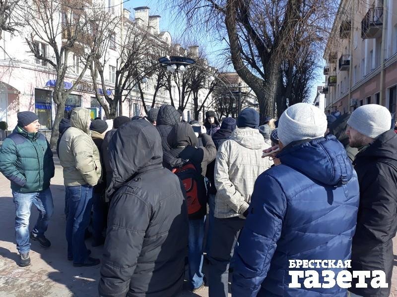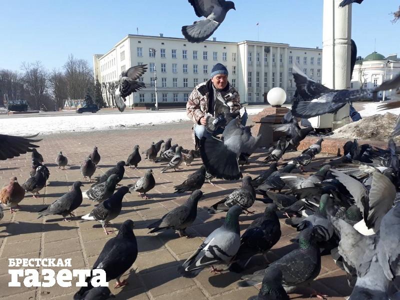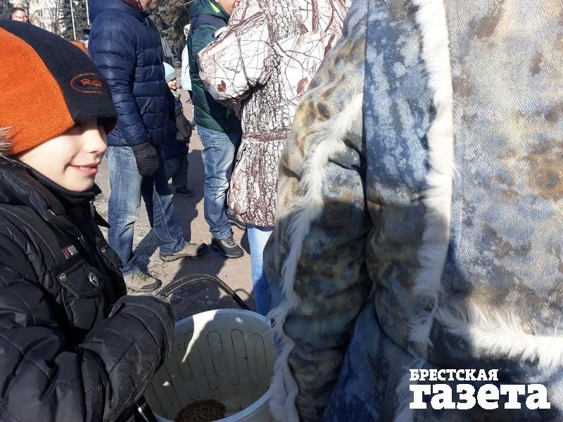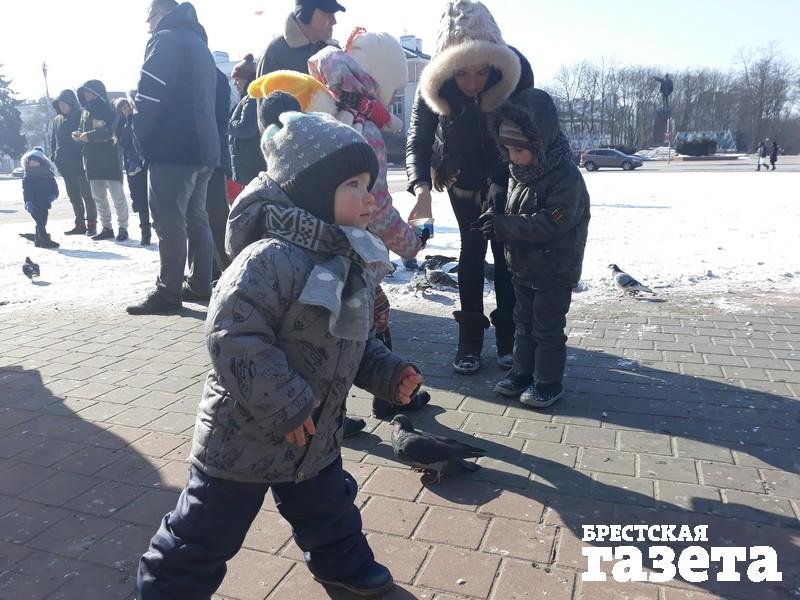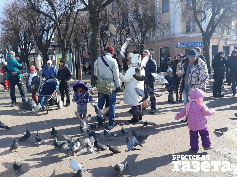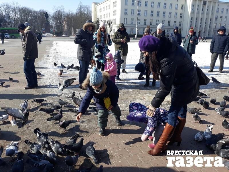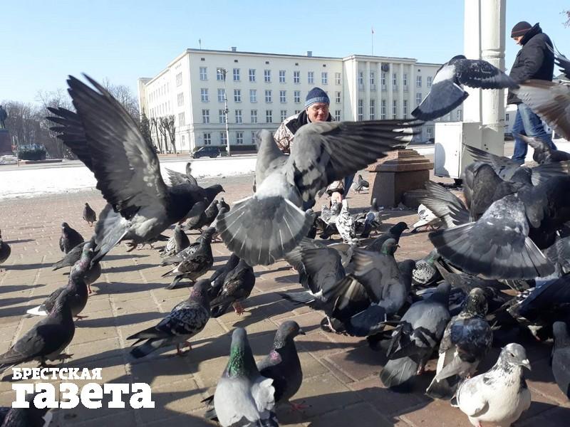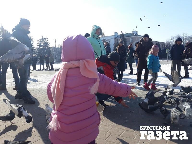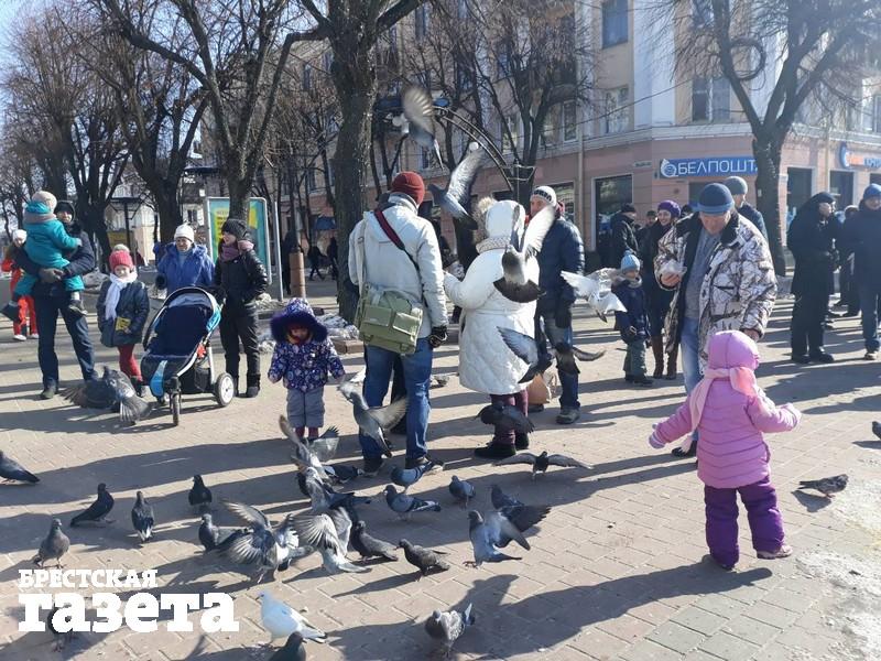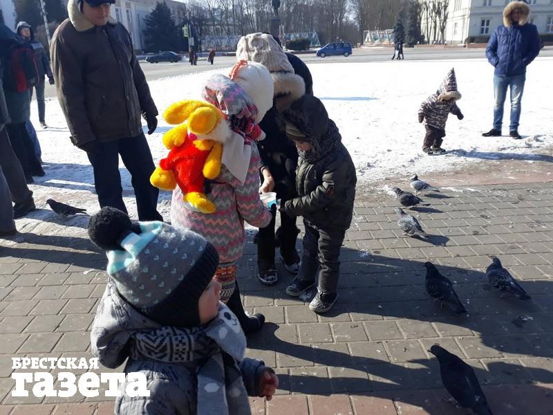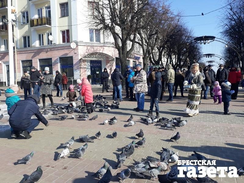 В полдень 4 марта на площади Ленина в Бресте cобралось более 70 человек, многие из которых пришли с семечками, зерном, хлебом, чтобы покормить голубей. Те, кто не взял с собой корм, наблюдали за происходящим.