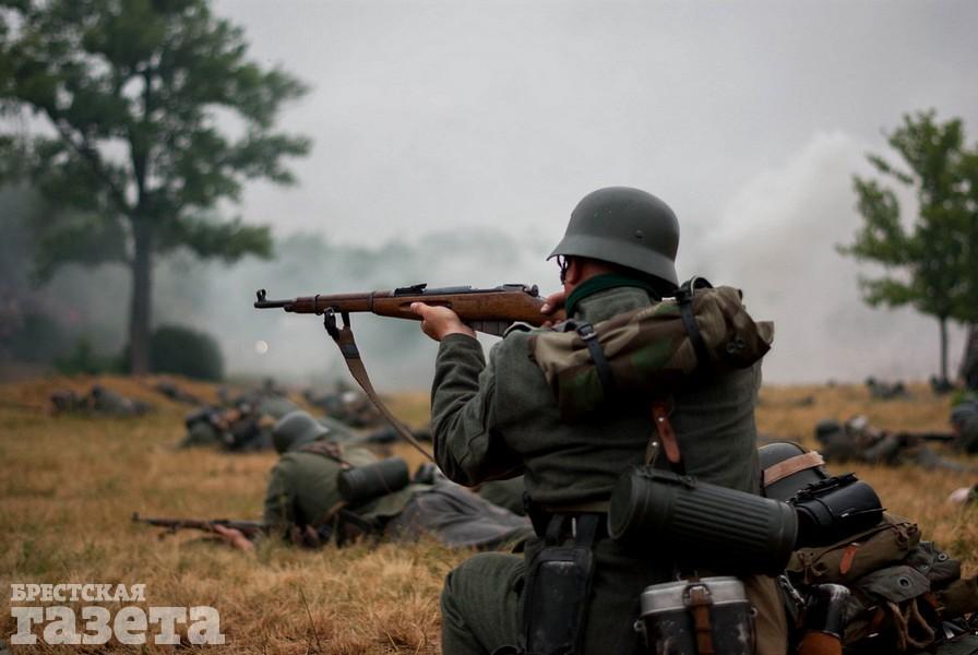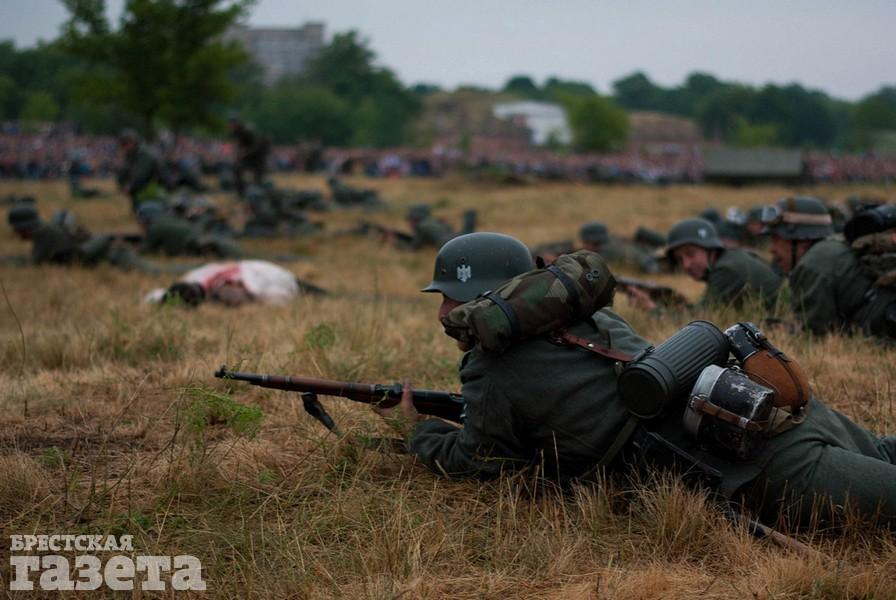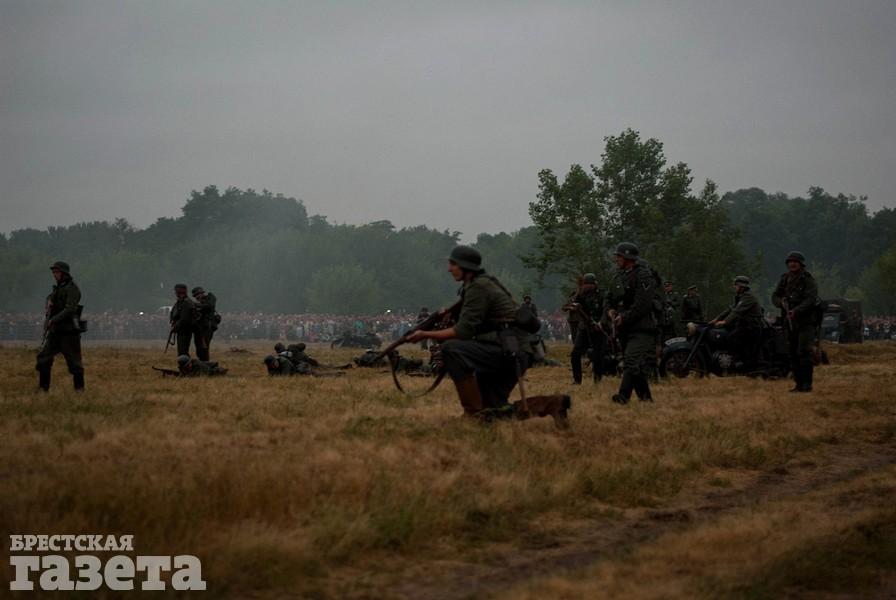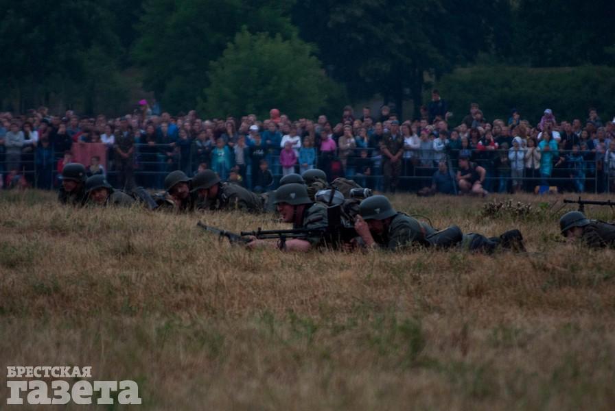 Началось действо с показа мирной жизни гарнизона и того, как войска НКВД отлавливали диверсантов. Эта картина сменилась внезапным артналетом фашистов. Одним из первых в бой с немецкой штурмовой группой вступил личный состав третьего батальона 84-го стрелкового полка под руководством Самвела Матевосяна. Его роль исполнил Олег Калашников из Воронежа.