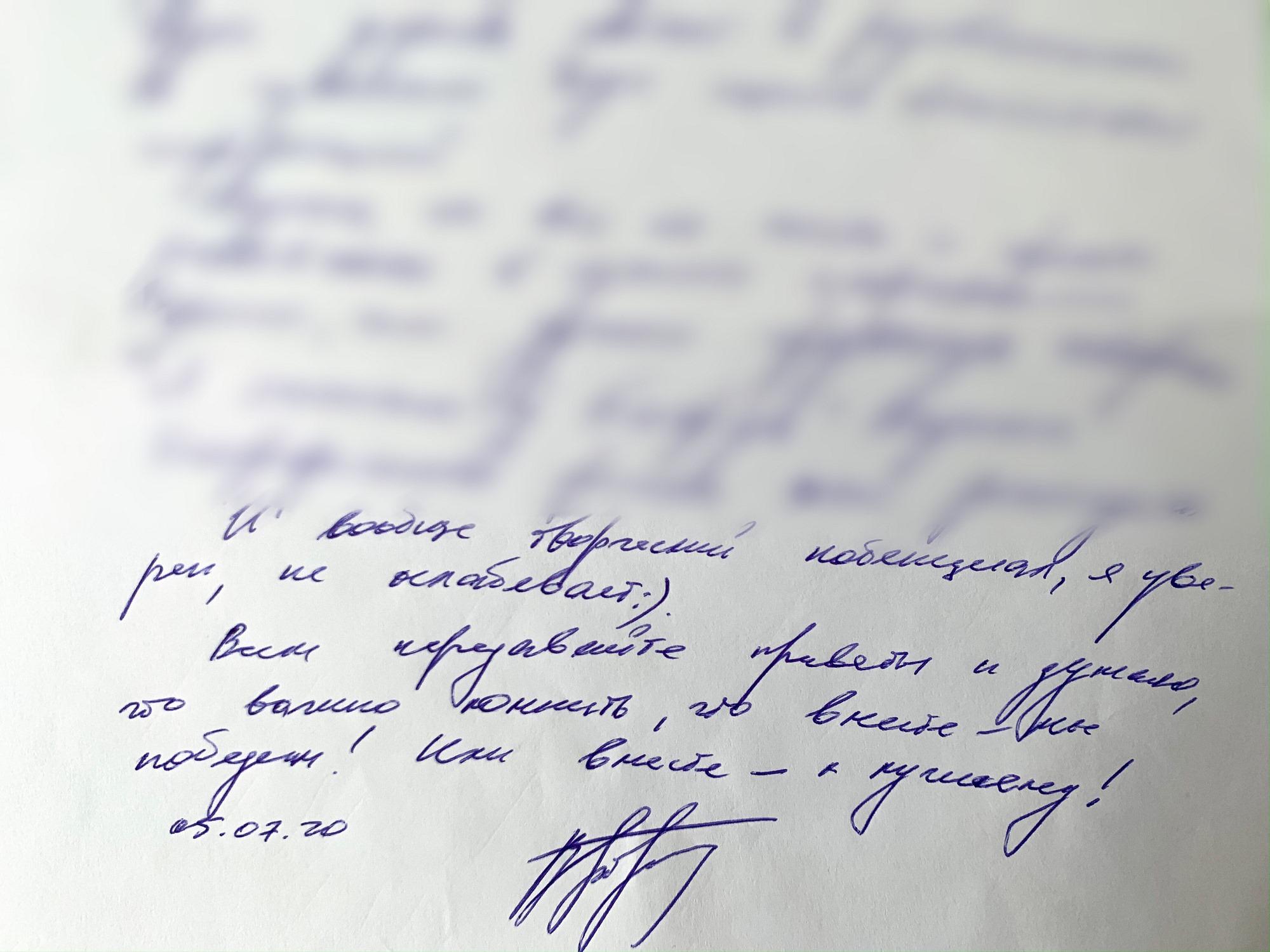 «Друзья, мы в штабе улыбаемся после этих строк! Мы, наконец, получили от него письмо», — радуется команда строкам. — Делимся с вами хорошим настроением и оптимизмом, берем в руки открытку, ручки и пишем ему наш ответ: «Мы не отчаиваемся, продолжаем работать и менять Беларусь к лучшему. Нас много. Вместе — мы победим!»