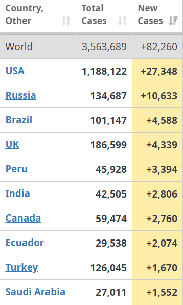 По состоянию на утро 4 мая во всем мире коронавирусом заразилось 3 507 265 человека (78,6 тыс новых случаев за сутки). Это данные Университета Джонса Хопкинса, который ведет статистику распространения заболевания.