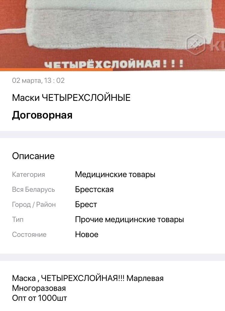 А этот парень из Пинска пошел еще дальше и заявил обычную маску как специальную от коронавируса. «Лучший защитник от короны и на стиле в черном цвете», – говорится в объявлении.