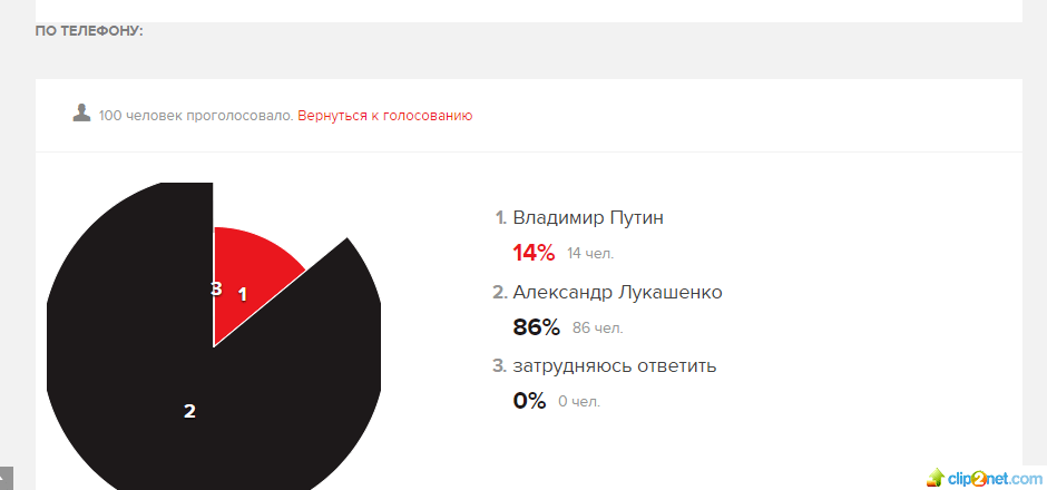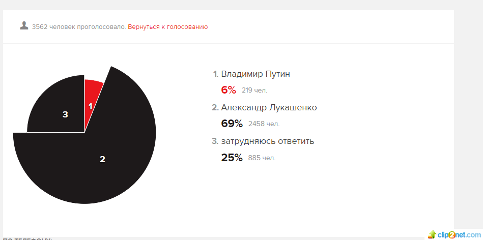 Из них за Путина в сети свои голоса отдали 216 человек (6%), а по телефону 14 (14%). У Лукашенко результат гораздо выше. В сети его поддержали 2 458 человек (69%), а по телефону – 86 (86%). Ровно четверть голосовавших — 885 человек — не определились с выбором.