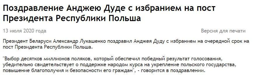 К слову, после президентских выборов Лукашенко поздравлял Дуду с победой. В официальном поздравлении говорилось про «выбор десятков миллионов поляков».