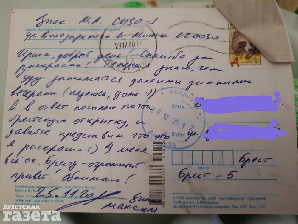 Брестчанка Ирина, которая, несмотря на наличие четверых детей, младшему из которых год, оказалась в Ленинском РОВД за участие в несанкционированном массовом мероприятии. Она поделилась с «БГ» открыткой, которую получила от юриста, а теперь политзаключенного Максима Знака.