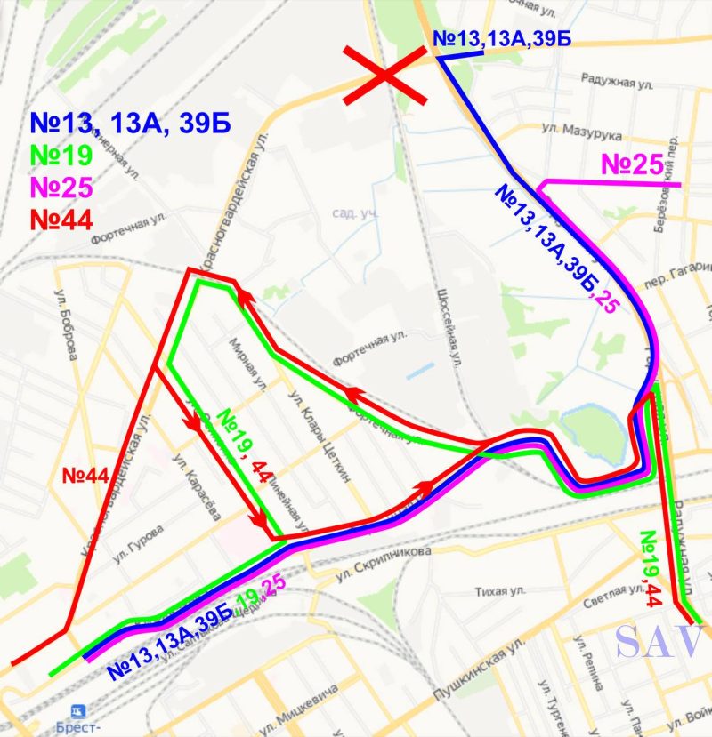 - №44 — по улицам Пионерская, Шоссейная, Фортечная, Красногвардейская и Брестских Дивизий в прямом направлении и по улицам Брестских Дивизий, Красногвардейская, Осипенко и Шоссейная в обратном направлении.