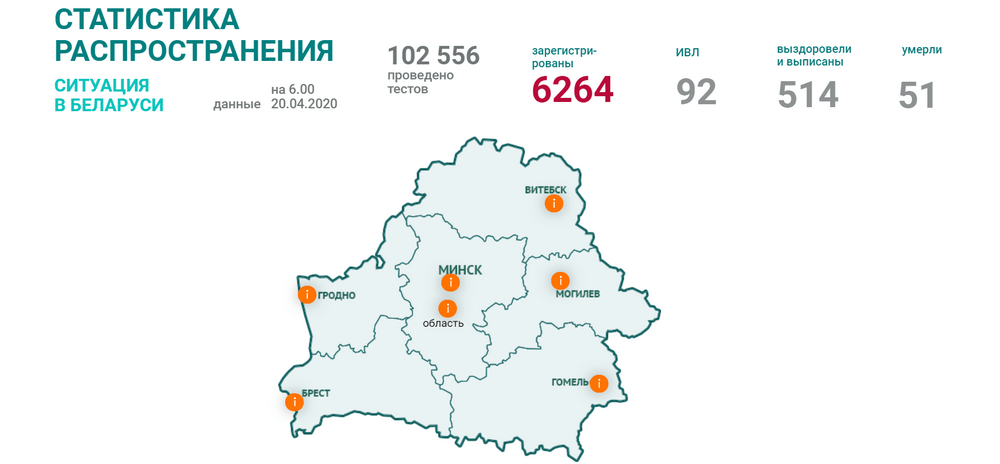 По данным на 20 апреля, в Беларуси зарегистрировано 6 264 положительных теста на COVID-19, сообщает Минздрав.