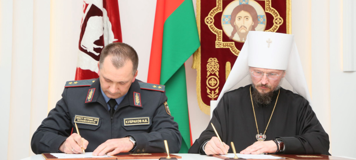 В пятницу 21 мая Министерство внутренних дел и Белорусская православная церковь подписали соглашение о сотрудничестве, которое предусматривает взаимодействие МВД и БПЦ в области профилактики вовлечения подростков и молодежи в незаконный оборот наркотиков, реабилитации лиц, потребляющих наркотики, включая социальную помощь и духовно-нравственное воспитание. Об этом сообщает сайт МВД.