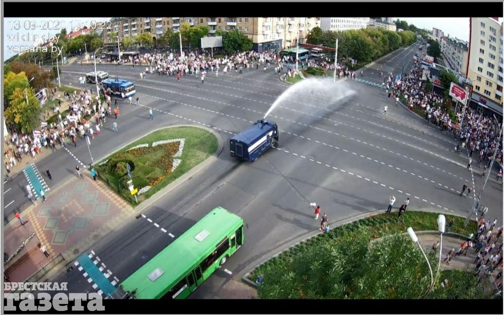 «Сегодня в Бресте около 16.50 было заблокировано движение транспортных средств на перекрестке проспекта Машерова — бульвара Космонавтов. Около тысячи человек в центре перекрестка водили хороводы, пели песни и выкрикивали различные лозунги. Своими действиями участники несанкционированного массового мероприятия блокировали движение общественного транспорта, создали реальную угрозу безопасности дорожного движения другим его участникам. С целью восстановления нормальной жизнедеятельности граждан и обеспечения безопасности дорожного движения был использован водомет», — пояснили в МВД.