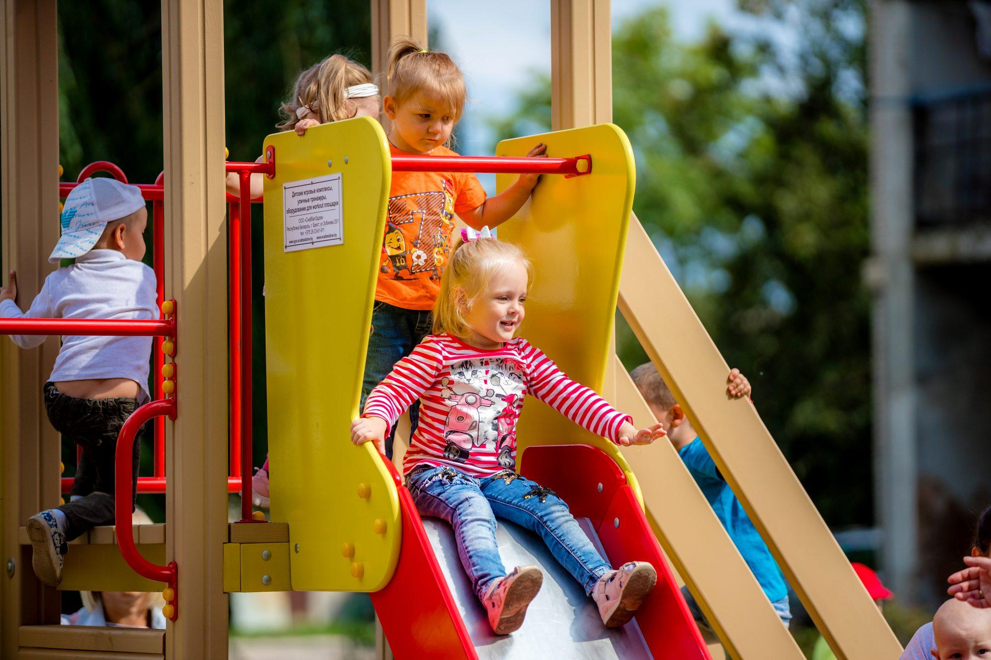 В центре игровой зоны – небольшая Ратуша, где можно свободно лазить и кататься. Наверх ведет лестница, а быстро спуститься позволяет разноцветная горка.