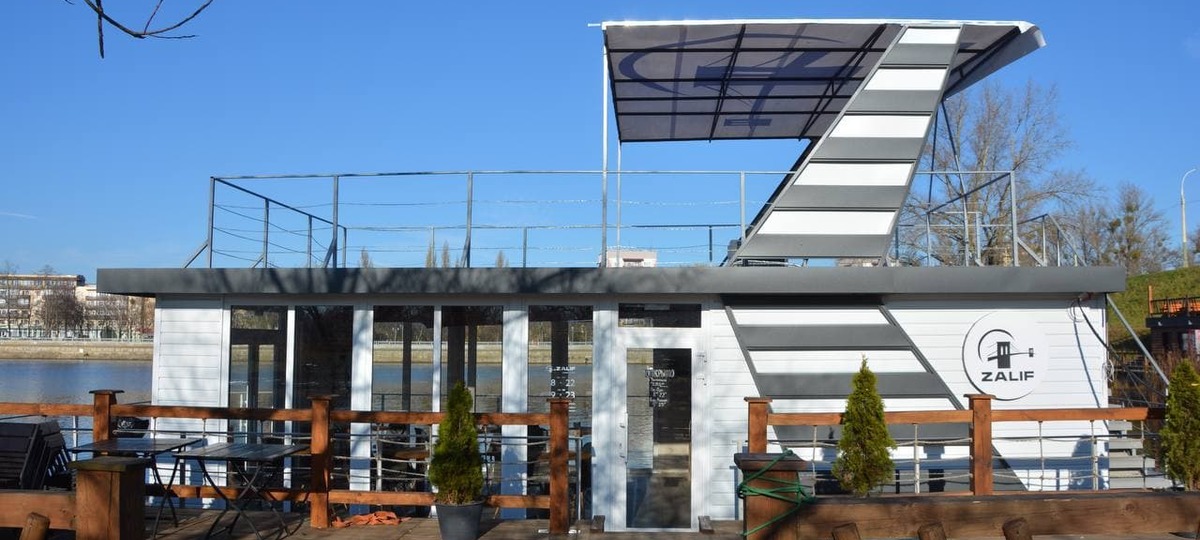 Название кафе связано с местом его дислокации – пришвартовано в заливе Мухавца. Эмблема кафе также содержит привязку к его месторасположению – на ней прорисован мост через реку. В настоящее время ZALIF может принять 24 клиента.