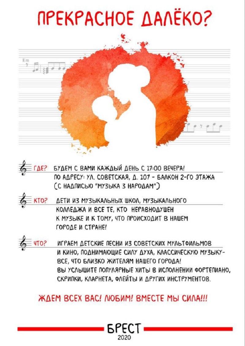 «Акция должна прирастать всеми, кто желает спеть и сыграть. Не важно, есть музыкальное образование или нет. Если имеете навыки и хотите донести душевное тепло до людей, то пожалуйста, приходите и участвуйте. Наша площадка «Музыка с народом» открыта для всех, но в первую очередь будут играть дети. Эта акция проводится в защиту наших детей, а особенно тех, кого избивает милиция на улицах и площадях городов Беларуси».