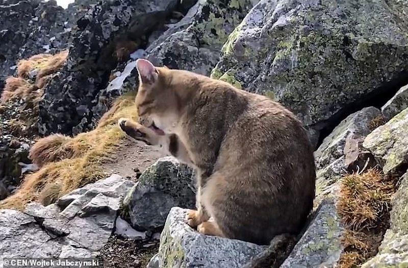 Альпинист Войцех Ябчинский взошел на самую высокую точку Польши — гору Рысы — и очень удивился, когда увидел там непринужденно умывающегося домашнего кота. Парень сфотографировал его и поделился снимками в соцсетях, сообщает dailymail.co.uk.