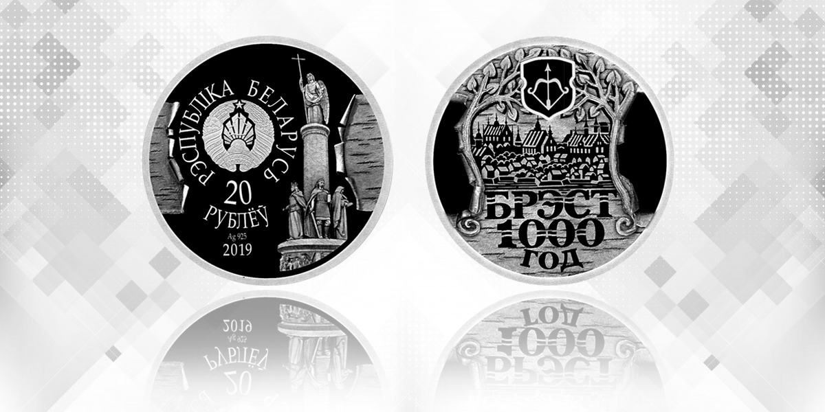 Нацбанк Беларуси с 5 апреля выпустил в обращение памятные монеты «Брэст. 1000 год»: серебряную – номиналом 20 рублей, массой 33,63 г, диаметром 50,00 мм, пробой сплава 925, тиражом 1 200 штук и медно-никелевую – номиналом 1 рубль, массой 19,50 г, диаметром 37,00 мм, тиражом 4 000 штук.