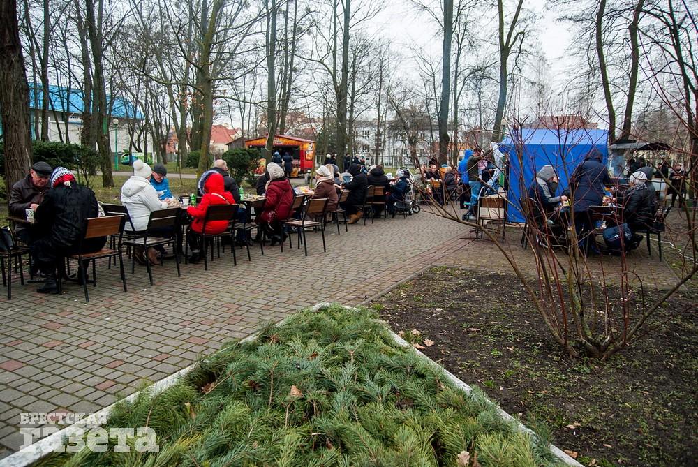 Людей в парке было мало – возможно, народ отдал предпочтение застолью в честь мужского праздника. А, может, погода — в Бресте 23 февраля то и дело шел довольно сильный дождь, аргументом не пойти гулять был и сильный ветер.