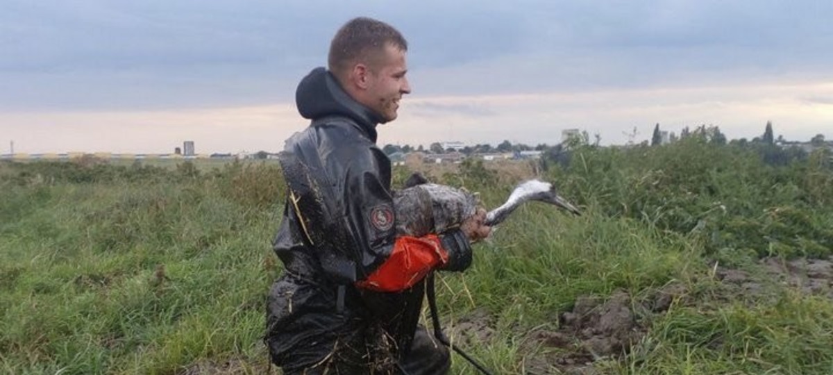 Мужчина предложил принести сноп соломы с соседнего поля. Спасатели оценили идею, и четверо парней вместе дотащили сверток до плотины. Один из присутствовавших бросил солому поверх грязи, чтобы добраться до птицы и вытащить ее. Журавль был очень слаб и не мог летать.