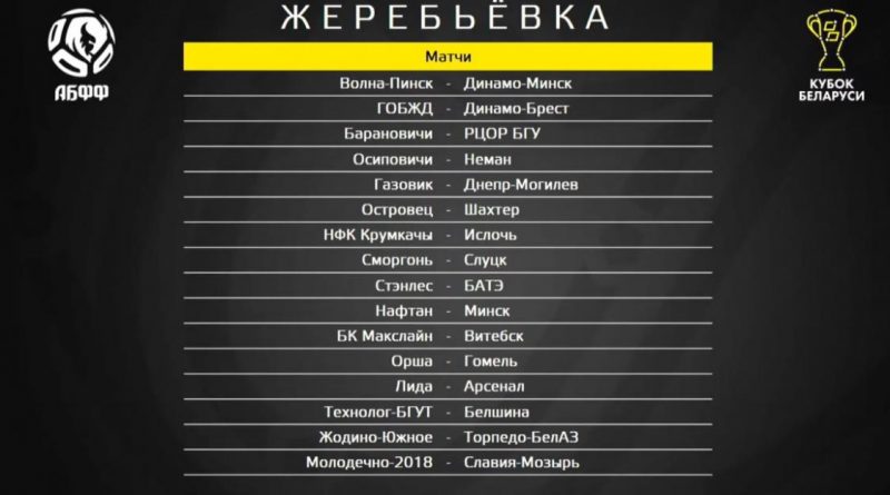 31 мая в Минске в Доме футбола прошла жеребьевка матчей 1/16 финала Кубка Беларуси. БАТЭ и минское «Динамо» сыграют в гостях с командами из Пинска: борисовчане — с командой «Стэнлес» из второй лиги, а динамовцы — с «Волной» из первой лиги.