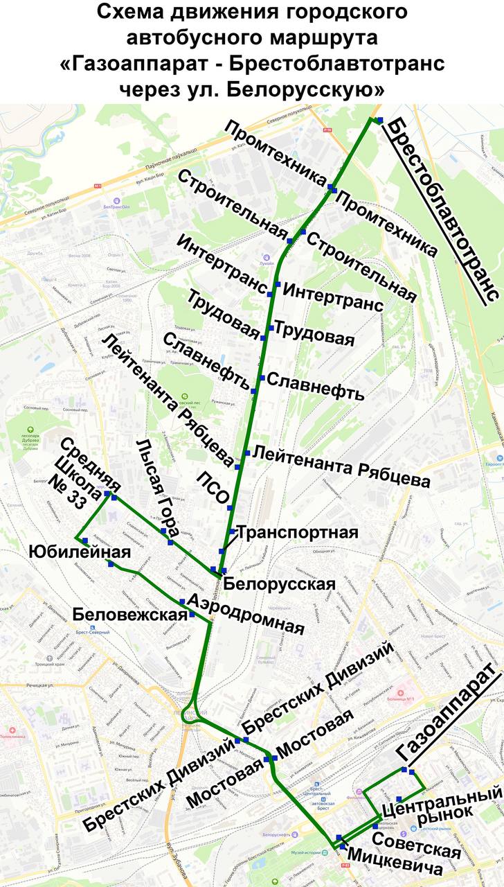 С 31 августа в Бресте открывается новый городской автобусный маршрут №49 «Газоаппарат – Брестоблавтотранс через ул. Белорусскую». Об этом сообщает председатель горисполкома Александр Рогачук.