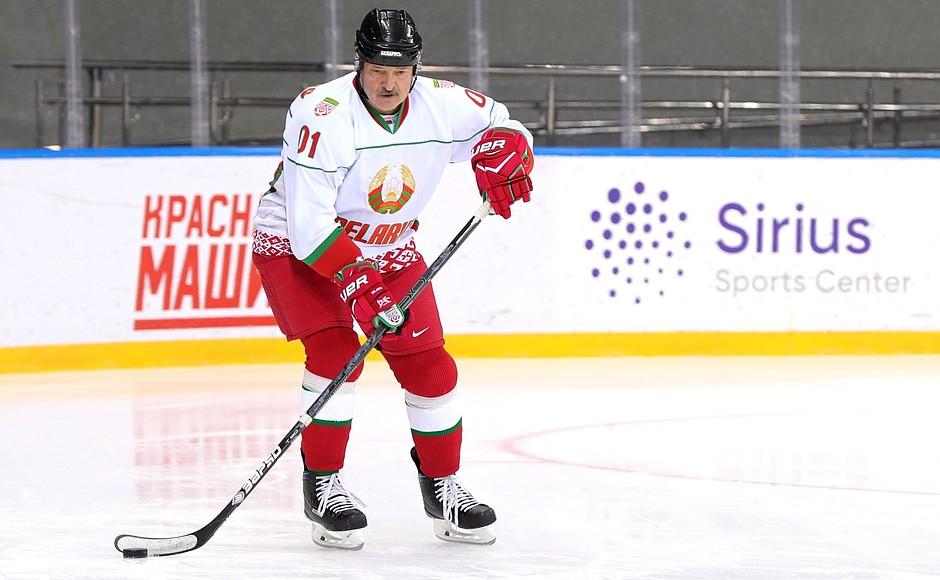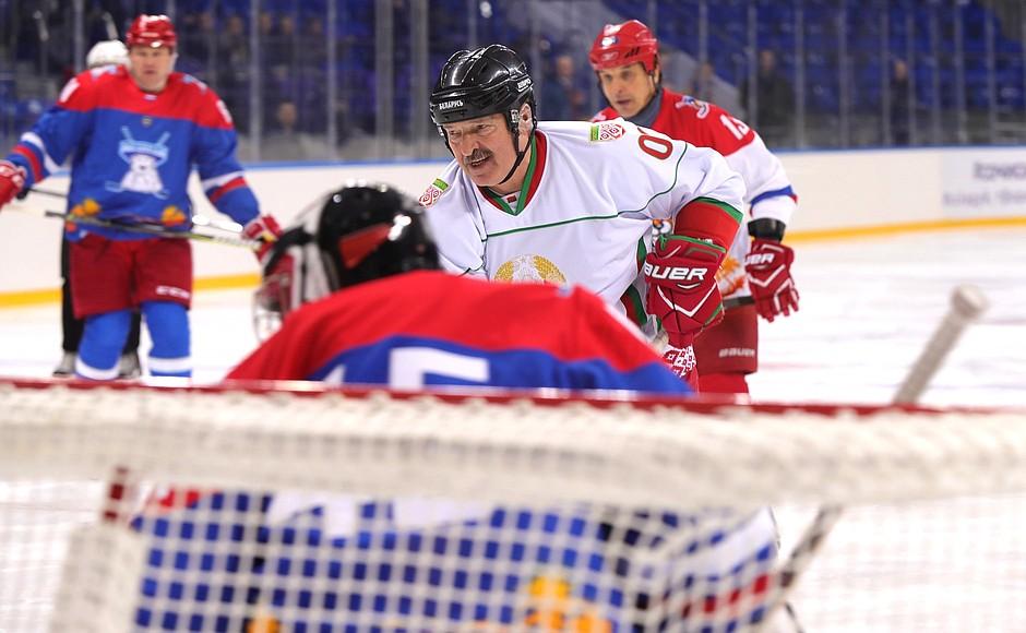 Российский и белорусский лидеры играли в команде «Тигры» против «Медведей». Вместе с президентом Беларуси, тоже в майке под первым номером, играл и его сын Николай, который забил одну из первых шайб. Итоговый счет — 16:1.