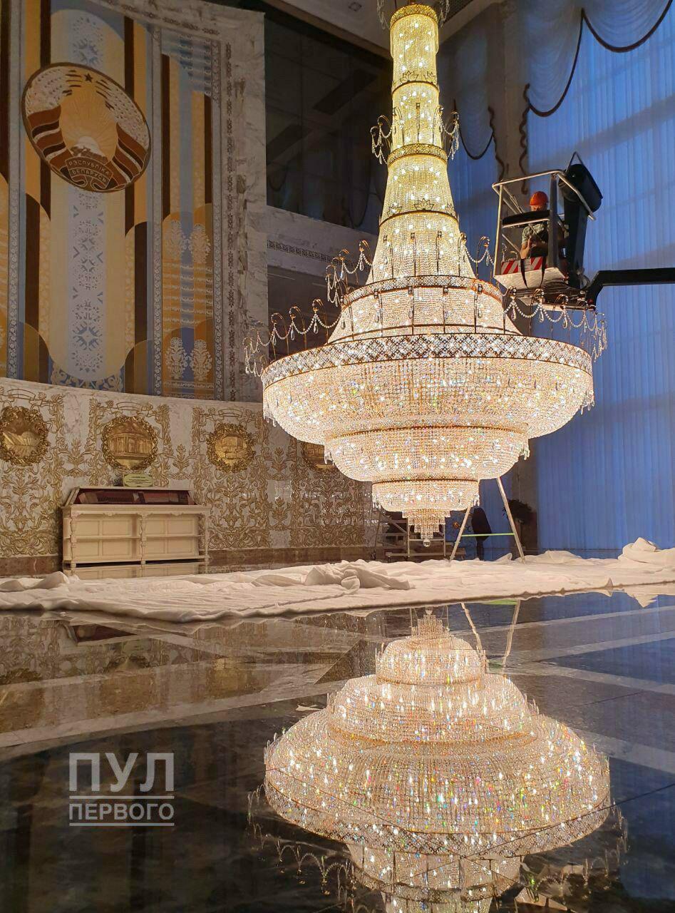 В Телеграм-канале «Пул Первого» появилось фото, на котором мужчина в спецодежде меняет лампочки на гигантской люстре во Дворце Независимости в Минске. При этом сама люстра приспущена практически до пола, а человек находится в люльке, на голове у него каска.