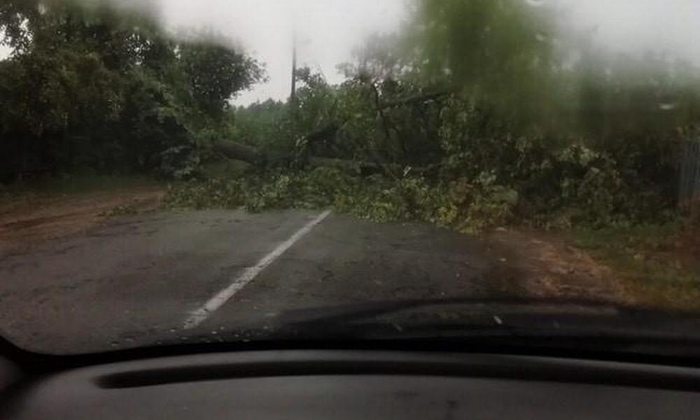 В Ляховичском районе сильный ветер повалил на проезжую часть деревья. Людям пришлось вручную расчищать себе проезд по трассе.