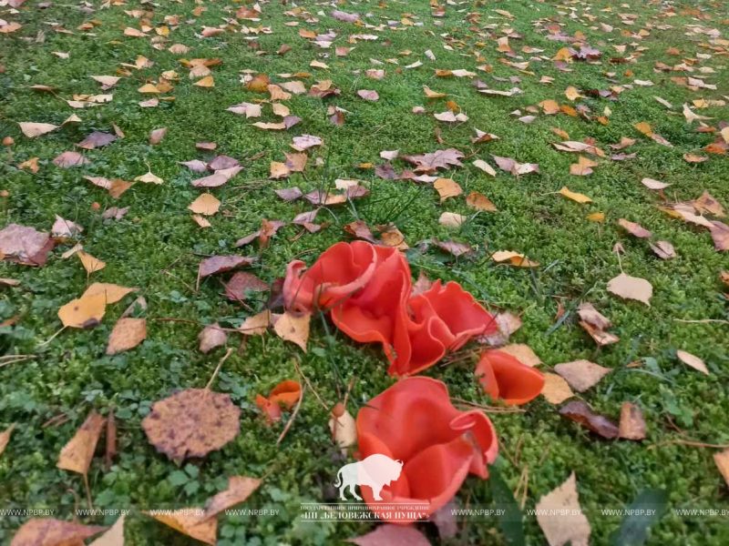Как оказалось, яркая, похожая на цветок алеврия оранжевая (лат. Aleuria aurantia) выросла даже не в лесу, а на территории гостиничного комплекса в Беловежской пуще.