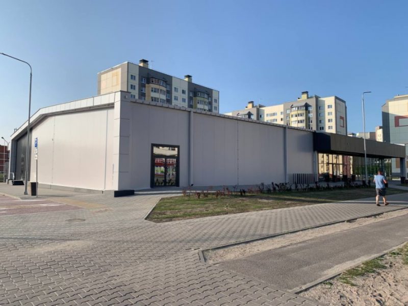 Внутри здания ведутся подготовительные работы к открытию объекта. Судя по функционалу, это должен быть магазин какого-то продуктового ритейлера. На здании пока нет вывески, но по его дизайну и некоторым инсайдам, с большой долей вероятности здесь откроется «Евроопт».