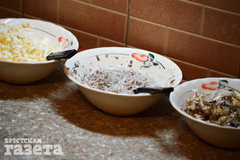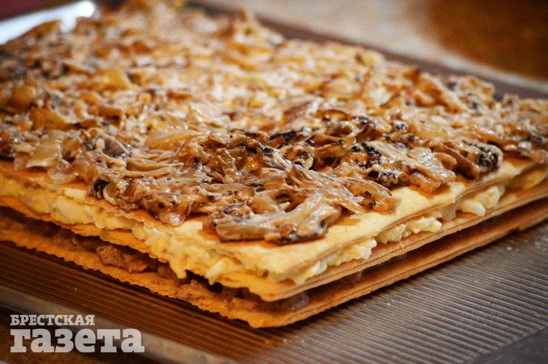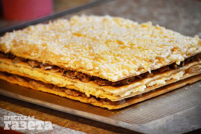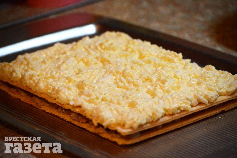 На первый корж выложите рыбную начинку, на второй — яичную, на третий — луковую, на четвертый — сырную.